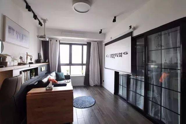 除了茶几、电视柜也是可以舍弃的部分,把收纳集中在沙发背景墙上,用幕布代替电视,整个客厅看起来特别的宽敞。