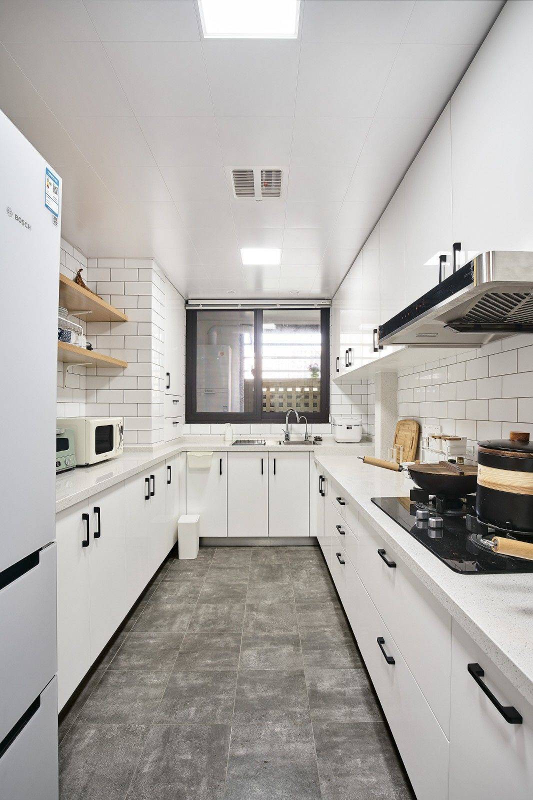 厨房灰白色搭配,视觉上大气整洁。U型设计,拓宽了操作台,同时有足够的储物空间,保证厨房收纳整洁。
